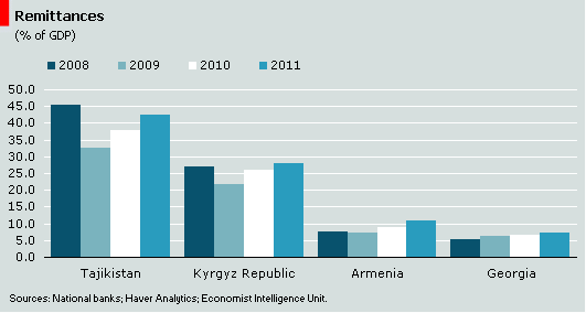 Նշենք, որ Economist Intelligence Unit-ը բրիտանական Economist հանդեսի վերլուծական հավելվածն է։ Հետազոտության հեղինակները գրում են, որ արտերկրում աշխատող հայաստանցիների` հայրենիք ուղարկած գումարների ծավալի աճը 2011 թվականի հունվարից անշեղորեն նվազում է։ Արձանագրելով, որ Հայաստան եկող մասնավոր տրանսֆերտների մեծ մասը Ռուսաստանից է, EIU-ի մասնագետները կարծիք են հայտնում, որ աճի տեմպերի նվազման այս միտումը նախևառաջ ռուսական տնտեսությունում առկա անկայունության արդյունք է: