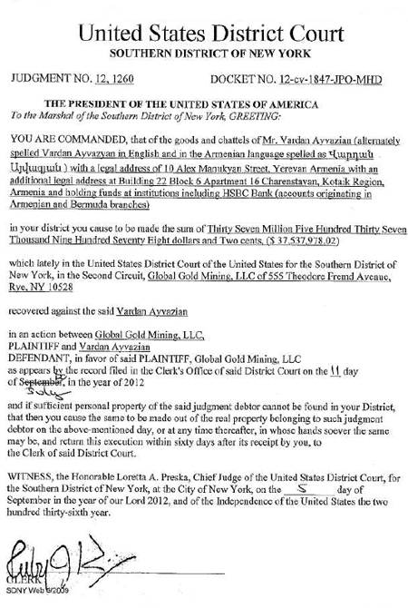 Սեպտեմբերի 6-ին Միացյալ Նահանգների Նյու Յորքի հարավային շրջանի Դատական ակտերի կատարման ծառայությունը կատարման է տրամադրել Կատարողական թերթ՝ Վարդան Այվազյանի հանդեպ կատարման համար հոգուտ «Գլոբալ Գոլդ Մայնինգ» ՍՊԸ-ի («ԳԳՄ»)։ Կատարողական թերթը տրամադրվել է դատավոր Զեյ Փոլ Օտկենի (J. Paul Oetken) որոշման հիման եւ այդ որոշումը (թիվ. 12,1260), առանց բողոքարկման, վերջնական ուժի մեջ մտնելուց հետո։ Կատարման թերթի պայմաններով ԳԳՄ-ի օգտին կայացրած որոշմամբ պետք է գանձվի երեսունյոթ միլիոն հինգ հարյուր երեսունյոթ հազար ինը հարյուր յոթանասունութ ԱՄՆ դոլար եւ երկու ցենտ ($37,537,978.02):