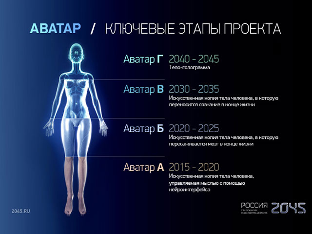 Իցկովի մտահղացման համաձայն, ապագայում մարդկային մարմինները հնարավոր կլինի փոխարինել ոչ կենսաբանական կրիչներով, որոնք կփոխպատվաստվեն մարդու ուղեղում: Գրաֆիկը հետևյալն է. մինչև 2020 թվականը պետք է հայտնվեն մտքի ուժը ղեկավարող ռոբոտներ: Մինչև 2025 թվականը պետք է հնարավոր լինի ուղեղի փոխադրում արհեստական ապաստան՝ նրա կենսագործության պահպանման դեպքում: