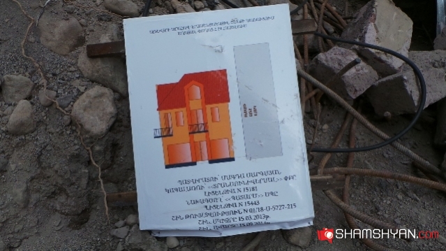 Նշվում է, որ դեպքի վայրում կա նաև ընկած ցուցանակ, սակայն ցուցանակը չունի կնիք: Ցուցանակի վրա գրված է պատվիրատու Մագդա Սարգսյան, կապալառու «Տրանս ունիվերսալ» ՓԲԸ, լիցենզիա համար 15 181, նախագծող «ՊատԱրմ» ՍՊԸ: Ցուցանակից պարզ է դառնում, որ պետք է կառուցվի 4 հարկանի բնակելի շենք, շինարարության սկիզբ է գրված 15.03.2013թ, ավարտը՝ 15.09.2014թ: