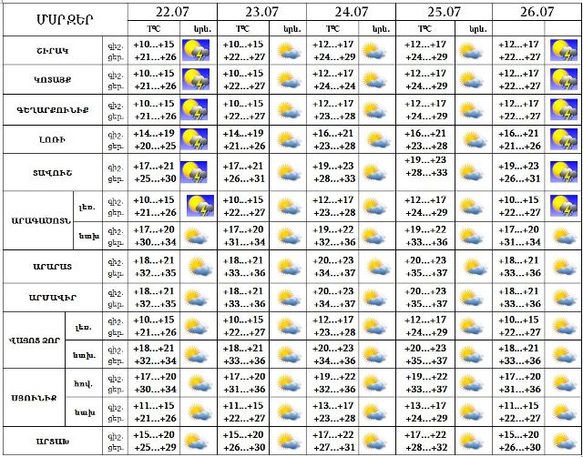 Հուլիսի 22-ին, 26-ին հյուսիսային շրջաններում գիշերվա առաջին կեսին և օրվա երկրորդ կեսին հնարավոր է կարճատև անձրև և ամպրոպ, առանձին հատվածներում՝ կարկուտ: