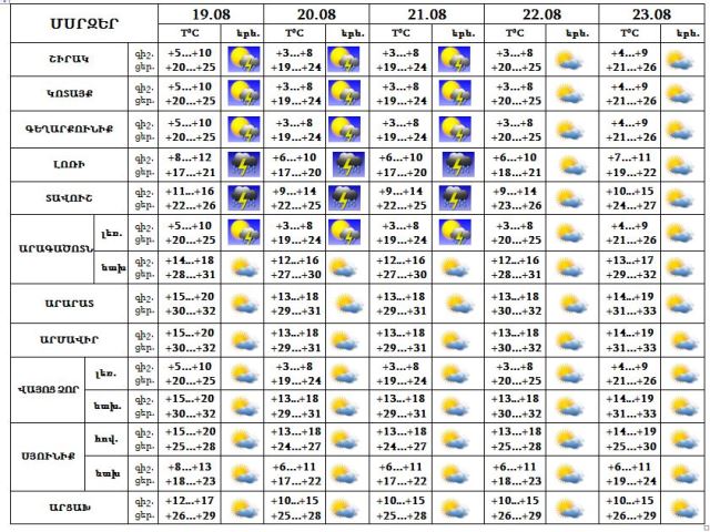 Օգոստոսի 19-21-ին հյուսիսային շրջաններում գիշերվա առաջին կեսին և օրվա երկրորդ կեսին սպասվում է կարճատև անձրև և ամպրոպ, տեղ-տեղ հնարավոր է կարկուտ, 22-23-ին սպասվում է առանց տեղումների եղանակ: Քամին` հարավ-արևմտյան 5-10 մ/վրկ, ամպրոպի ժամանակ սպասվում է քամու ուժգնացում` 18-23 մ/վրկ: Օդի ջերմաստիճանը օգոստոսի 19-20-ին կնվազի 4-5 աստիճանով, 22-23-ին կբարձրանա 2-3աստիճանով: