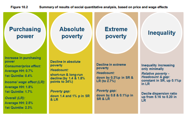 Գների և աշխատավարձերի փոփոխություններն, ըստ զեկույցի հեղինակների, ԽՀԱԱԳ-ի հիմնական սոցիալական շարժիչներն են, որովհետև դրանք ազդում են տնօրինվող եկամտի և աղքատության մակարդակի վրա։ Գների միջին մակարդակի նվազումը և դրա հետ մեկտեղգ աշխատավարձերի աճը թույլ են տալիս ենթադրել, որ սոցիալական ազդեցությունը դրական կլինի։