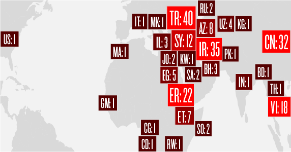 Թուրքիան ու Իրանն արդեն երկրորդ տարին անընդմեջ «առաջատար» են լրագրողներին բանտ նետելու հարցում՝ չնայած նրան, որ այս տարի նրանք ազատ են արձակել մի շարք լրագրողների: Չինաստանում բանտարկված լրագրողների քանակը մնացել է նախկին մակարդակի վրա: