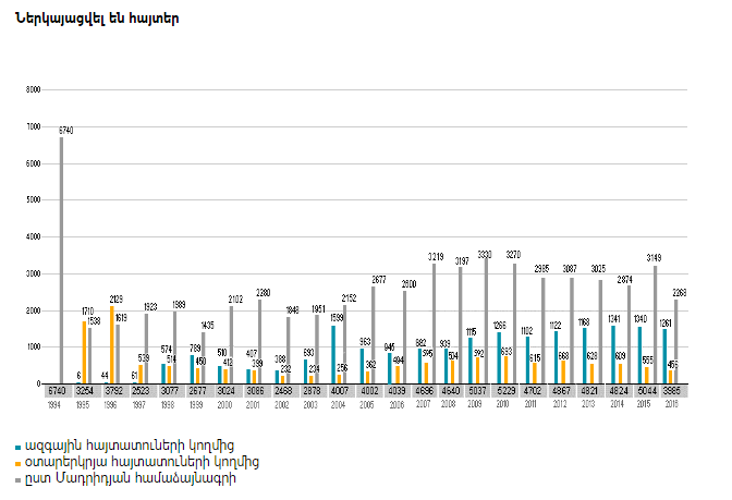 Հայաստանի Հանրապետությունից ներկայացվել է միջազգային գրանցման 30 հայտ։ 2016 թվականին ազգային հայտատուներից ստացվել է 1261 հայտ, որը 2015 թվականի համեմատությամբ նվազել է 79-ով: