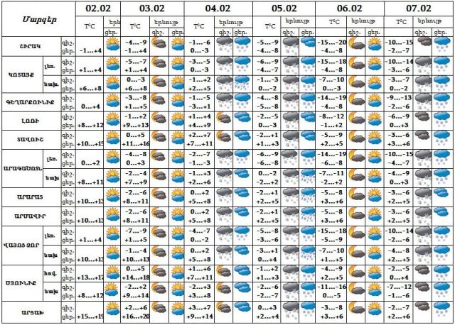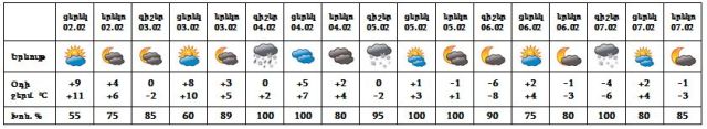 Փետրվարի 2-ի ցերեկը, 3-ին, 6-ին սպասվում է առանց տեղումների եղանակ: Փետրվարի 4-5-ը, 7-ի գիշերը սպասվում են տեղումներ: