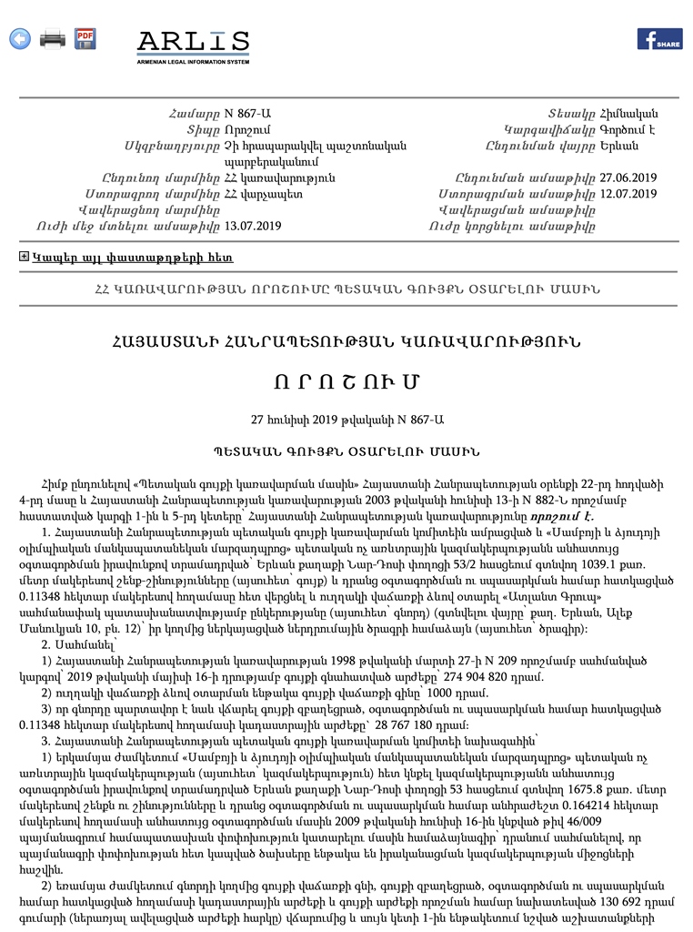 1. ՀՀ կառավարության 27.06.2019թ. թիվ 867-Ա որոշում