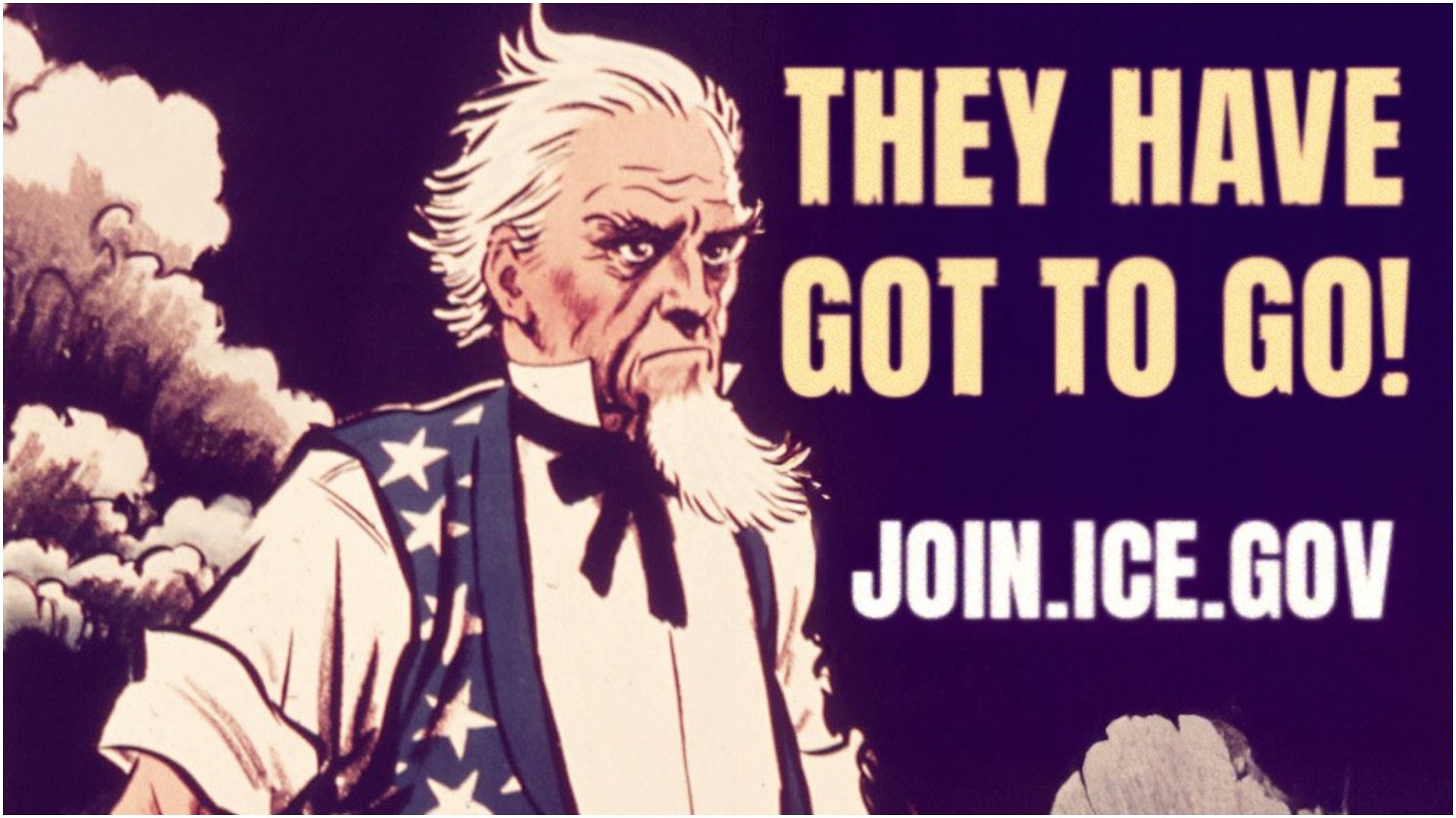 Գրառմանը կցվել է պաստառ, որտեղ պատկերված է քեռի Սեմին, ով կոչ է անում ամերիկացիներին միանալ իմիգրացիոն ոստիկանության շարքերին։