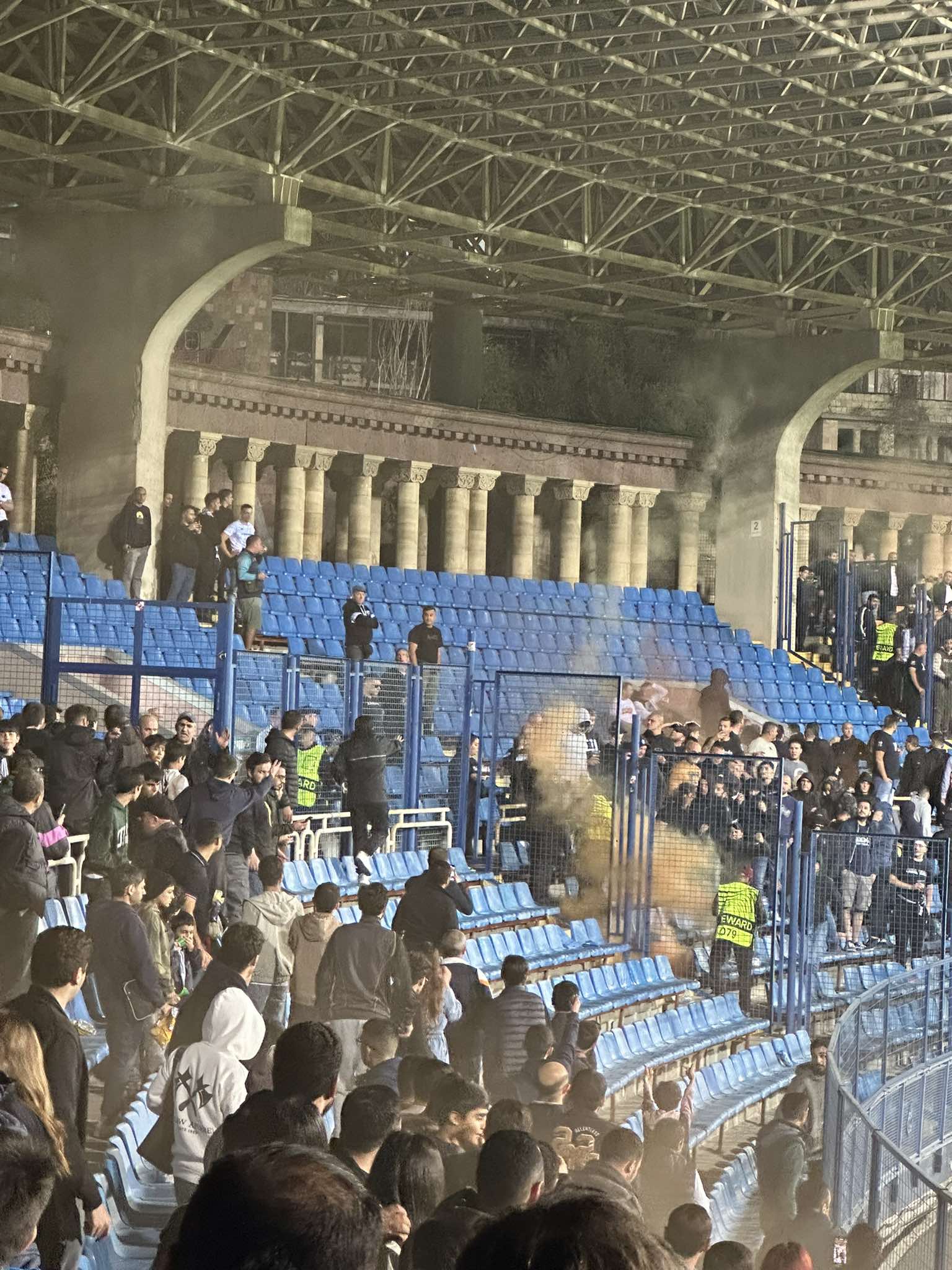 Խորվաթիայից մեծ թվով երկրպագուներ են ժամանել Երևան՝ աջակցելու «Ռիեկային»։ Նրանք քիչ առաջ իրենց հատկացված տրիբունայից պոկեցին նստետեղերից մեկի մի հատված ու նետեցին խաղադաշտի կողմ: Նրանք նաև գունավոր ծխեր են շպրտում հայ երկրպագուների կողմ»: