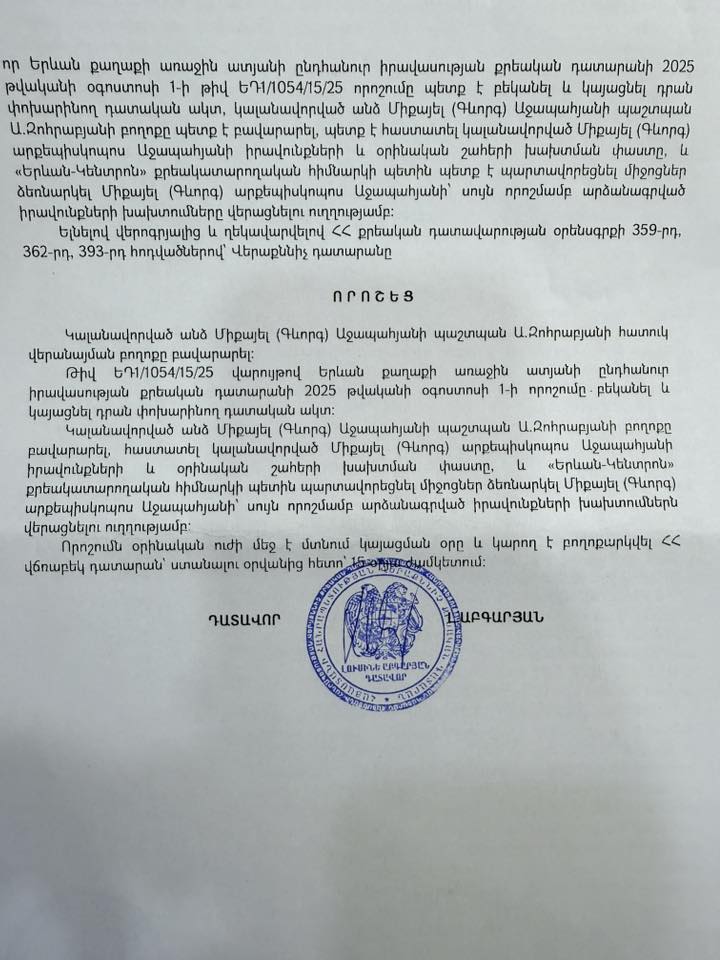 ՀՀ վերաքննիչ քրեական դատարանի դատավոր Լուսինե Աբգարյանը 06.10.2025թ. որոշմամբ բավարարել է բողոքս՝ բեկանելով դատավոր Մասիս Մելքոնյանի որոշումը և հաստատելով Միքայել Սրբազանի իրավունքների և օրինական շահերի խախտման փաստը: Վերաքննիչ դատարանը պարտավորեցրել է նաև «Երևան-Կենտրոն» քրեակատարողական հիմնարկի պետին միջոցներ ձեռնարկել արձանագրված իրավունքների խախտումները վերացնելու ուղղությամբ: