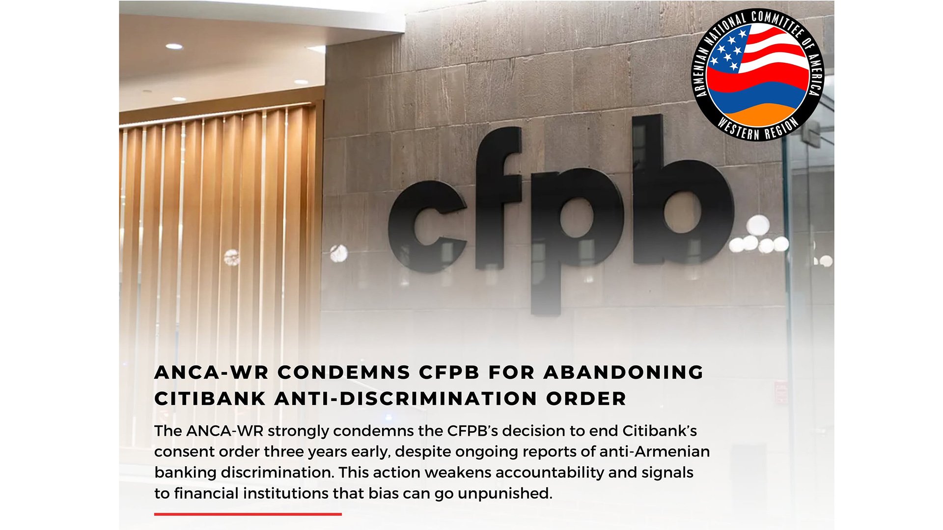 ԱՄՆ Հայ դատի հանձնախմբի Արևմտյան ափի գրասենյակը (ANCA-WR) խստորեն դատապարտում է Սպառողների ֆինանսական պաշտպանության բյուրոյի (CFPB) որոշումը՝ նախատեսված ժամկետից երեք տարի շուտ դադարեցնել «Սիթիբանկի» նկատմամբ կիրառված հակախտրական վերահսկողական որոշումը՝ այն դեպքում, երբ բանկը մեղադրվում էր հայ-ամերիկացիների նկատմամբ խտրական վարկային քաղաքականություն իրականացնելու մեջ։