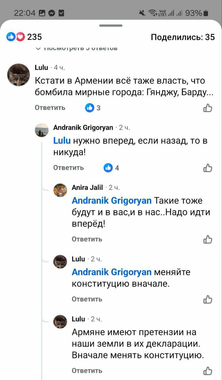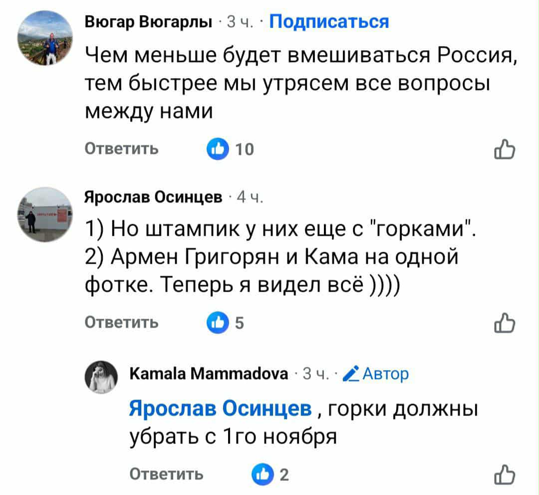 Իսկ Հայաստանի հնագույն մայրաքաղաքից նրանք հեռացել են գործող իշխանությունների վերաբերմունքից և երևանյան հանդիպման արդյունքներից գոհ, ինչի մասին բոլորը նույնաբովանդակ գրառումներ են կատարել սոցիալական ցանցերի իրենց էջերում: Գրառումներից այնպիսի տպավորություն է, կարծես բոլորին նույն «խաղաղասիրական» տեքստն է բաժանվել, որպեսզի տարածեն սոցցանցերի իրենց էջերում: Իսկ գրառումների տակ թողնված նրանց և շարքային ադրբեջանցիների մեկնաբանություններն այլ պատկեր են ստեղծում՝ պահանջներ, սպառնալիքներ, ատելության խոսք Հայաստանին, հայ ժողովրդին, իհարկե, կային նաև խաղաղ համակեցության կոչեր, բայց անգամ այս դեպքում հիշեցվում են «հայերի արածները»: