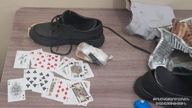 Մասնավորապես՝ կալանավորված անձի մոտ առկա սննդամթերքի տարայում պատրաստված թաքստոցից հայտնաբերվել են բջջային հեռախոս՝ բաժանորդային քարտով, և լիցքավորման լար, իսկ նրա հագին եղած կոշիկների ներբաններից հայտնաբերվել են թմրամիջոցի նմանվող դեղնականաչավուն բուսական զանգված՝ ընդհանուր 27,4 գրամ քաշով, և բյուրեղանման փոշեզանգված՝ 2,3 գրամ քաշով, ինչպես նաև 34 հատ գործարանային արտադրության խաղաթուղթ։