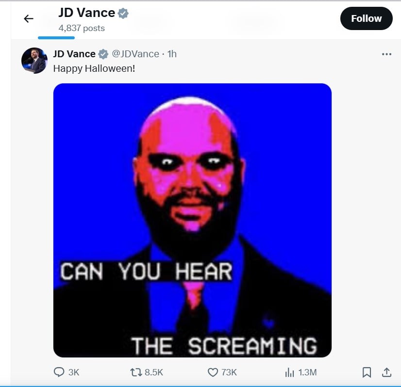 Հելոուինը չի շրջանցել Սպիտակ տունը. ԱՄՆ փոխնախագահ Ջեյմս Դեյվիդ Վենսը (Ջեյ Դեյ Վենսը) X-ի իր էջում շնորհավորել է  Հելոուինի տոնը՝ ինչ-որ լուսանկարով, որում պատկերված տղամարդը հիշեցնում է իրեն պատկերող մի «մեմ», իսկ վրան գրառում՝ «լսում ե՞ք ճիչը»: