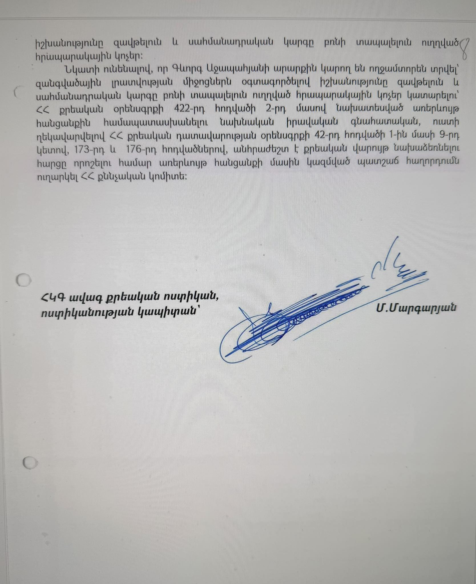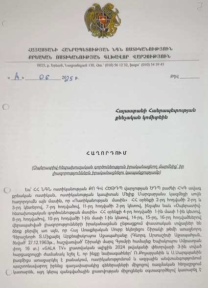 Կից տեղադրում եմ ոստիկանության աշխատակցի կողմից ներկայացված հաղորդման պատճենը և ՀՀ ոստիկանությանն ու ԱԱԾ-ին խնդրում եմ՝ օպերատիվ-հետախուզական միջոցառումների իրականացման միջոցով այդ հողորդման մեջ գտնել այն տողերը, որտեղ հաղորդում ներկայացրած անձը նշել է, թե իբրև առերևույթ հանցանքի կատարման փաստն իրեն հայտնի է դարձել ՀՀ դատախազության հանրային կապերի բաժնի կողմից իր գործառույթների իրականացման ընթացքում դիտարկված տեսանյութը ստուգելու լիազորությունը։