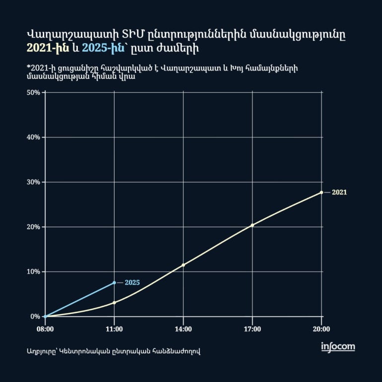 Ժամը 11։00-ի դրությամբ՝ Վաղարշապատ համայնքում ընտրության իրավունք ունեցող 69866 անձանից քվեարկությանը մասնակցել է 5283 մարդ