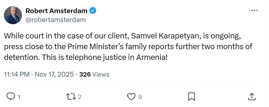 Սամվել Կարապետյանի փաստաբանական խմբի անդամ, միջազգային իրավապաշտպան Ռոբերտ Ամստերդամը գրում է. «Մինչ մեր պաշտպանյալ Սամվել Կարապետյանի գործով դատավարությունը շարունակվում է, վարչապետի ընտանիքին պատկանող լրատվամիջոցը հաղորդում է կալանքի ժամկետը ևս երկու ամսով երկարաձգելու մասին։