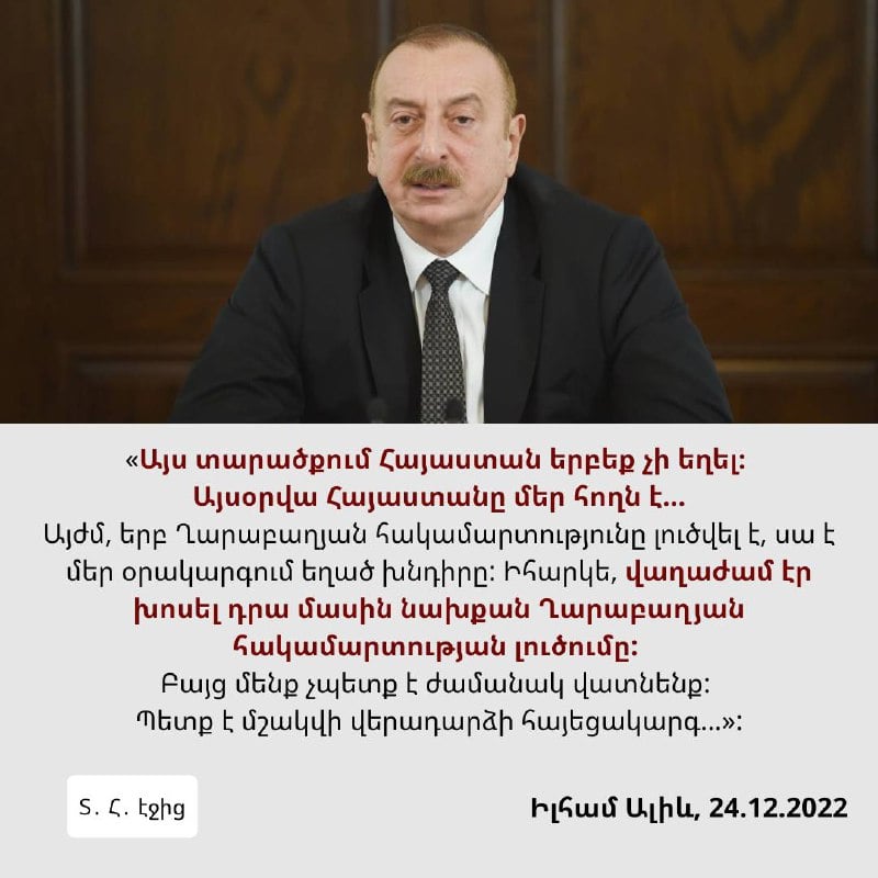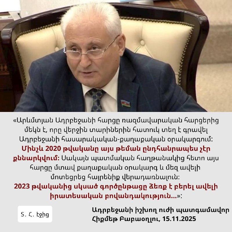 Հայկական պատասխանատու գերատեսչությունների՝ երեք տարվա հանցավոր անգործության պայմաններում այսօր Ադրբեջանում պետական հրահանգով ՀՀ տարածքը կոչում են «Արևմտյան Ադրբեջան»՝ տերմին, որը չունի որևէ աշխարհագրական, փաստական, պատմական ու անգամ տրամաբանական հենք, բայց փոխարենը ունի հեռուն գնացող շատ վտանգավոր միտումներ, որոնք հնարավոր է կանխել խելացի ու կազմակերպված աշխատանքով, այլ ոչ թե հանրությանը խաբել «հաստատված խաղաղության» մասին ստերով…»: