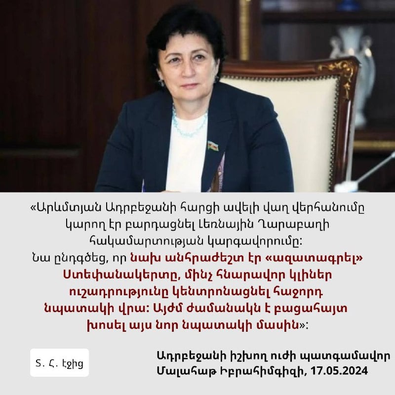 Ադրբեջանի հարցերով փորձագետ Տաթև Հայրապետյանի Թելեգրամի իր էջում հրապարակել է մի քանի լուսանկարներ՝ կից գրառմամբ. «Թե՛ Իլհամ Ալիևը, թե՛ ադրբեջանցի այլ պաշտոնյաներ շատ ուղիղ տեքստով խոսում են այն մասին, որ խնդիրը հայերի և Հայաստանի հետ երբեք չի սահմանափակվել Լեռնային Ղարաբաղով։ Ավելին, նրանք խոստովանում են, որ քանի դեռ կար Լեռնային Ղարաբաղի հակամարտությունը, իրենք ռիսկ չէին անում ակնհայտ զավթողական ծրագրերով հանդես գալ ընդդեմ Հայաստանի Հանրապետության։