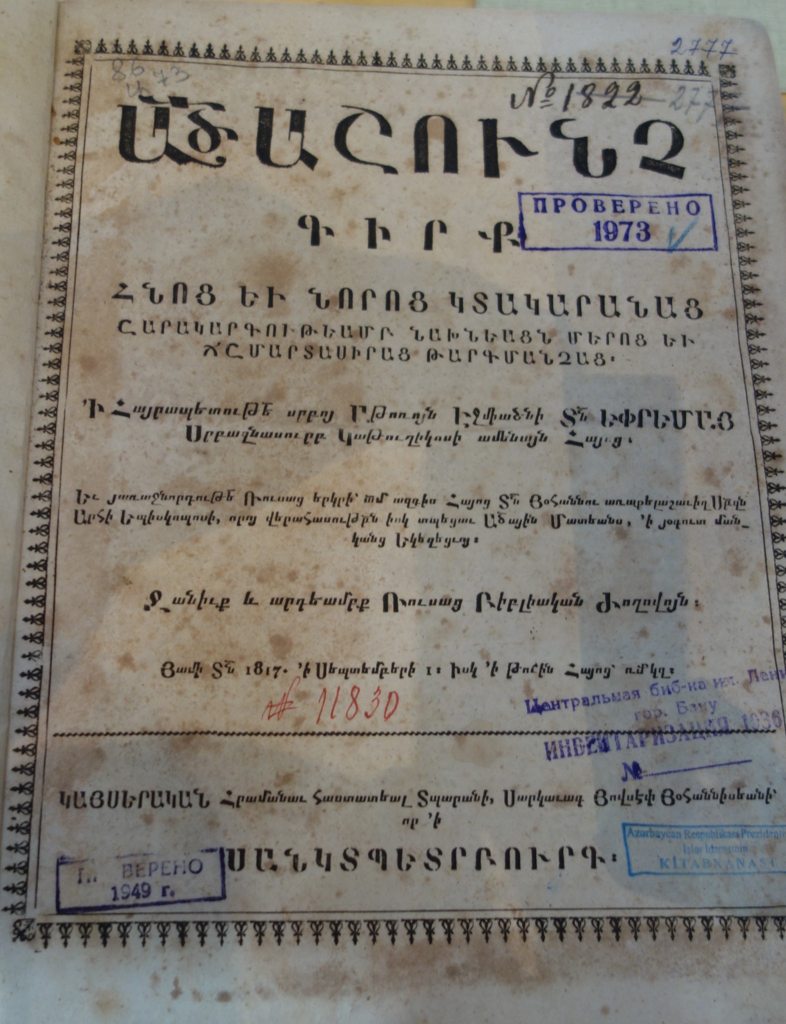 Լուսանկարում՝ 1817 թ․ Սուրբ Էջմիածնի կողմից տպագրված Աստվածաշունչը՝ Բաքվի՝ Սուրբ Գրիգոր Լուսավորիչ հայկական եկեղեցու շենքում։ Այն նույնպես ենթակա է տունդարձի»։