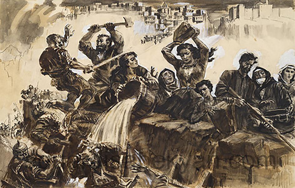 «Մխիթար Սպարապետը և Տեր-Ավետիքը հավաքեցին երեք հարյուր զինվորներ և սկսեցին պատրաստել նրանց հարձակում գործելու: Պարիսպների վրա կռվողները շարունակում էին իրենց գործը, Դավիթ Բեկի երկու հերոս օգնականները սիրտ էին տալիս այդ երեք հարյուրին, հասկացնում էին, թե որքան լավ է պատվով և քաջությամբ մեռնել պարիսպներից դուրս, քան մնալ բերդում և բաց աչքով տեսնել, թե ինչպես թշնամին պիտի կոտորե իրենց ընտանիքները և ուրիշ գազանություններ կատարե: Պատրաստելով ամենքին, Մխիթարն ու Տեր-Ավետիքը դուրս տարան այդ խումբը բերդի գաղտնի դռնով. Ամենքից առաջ իրենք էին գնում»: (Նույն տեղում, էջ 482):