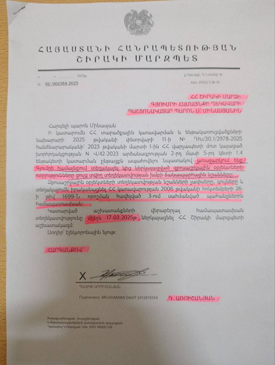 Այժմ ներկայացնում ենք այն փաստաթուղթը, որով Շիրակի մարզպետ Դավիթ Առուշանյանը դիմել էր քաղաքապետի ժամանակավոր պաշտոնակատար Սարիկ Մինասյանին` առաջարկելով Գյումրի քաղաքում տեղակայել զբոսաշրջային օբյեկտների ուղղությունները ցույց տվող տեղեկատվության խմբի ճանապարհային նշանները։