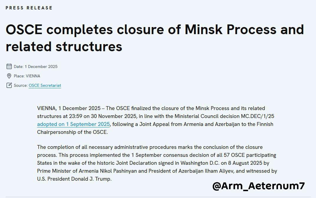 Արմեն Աշոտյանը ֆեյսբուքյան իր էջում գրում է. «Նիկոլ, քո հանցավոր գործունեության արդյունքում այսօր վերջնականապես լուծարվեց ԵԱՀԿ Մինսկի խումբը։