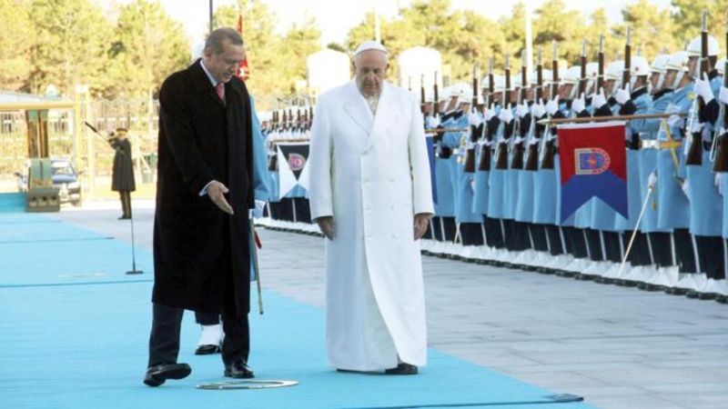 Կրկին քաղաքականություն. Ի դեպ, իր ելույթներում պոնտիֆիկոսը բոլորին նախազգուշացրել է երրորդ համաշխարհային պատերազմի սպառնալիքի մասին։ Բայց ոչ մի խոսք, օրինակ, Ստամբուլում ամենակարևոր քրիստոնեական սրբավայրերից մեկի՝ Սուրբ Սոֆիայի տաճարը մզկիթի վերածելու մասին։ Փոխարենը՝ նա ծրագրել էր այցելել Սուլթան Ահմեդի պատմական մզկիթ (Երկնագույն): Էրդողանն էլ հայտարարել է. «Մենք Վատիկանի հետ միասին կաշխատենք Արևելյան Երուսաղեմի սրբազան կարգավիճակի ցանկացած խախտման դեմ»: Սուրբ Սոֆիայի կարգավիճակը, ըստ երևույթին, հաշվի չի առնվում։