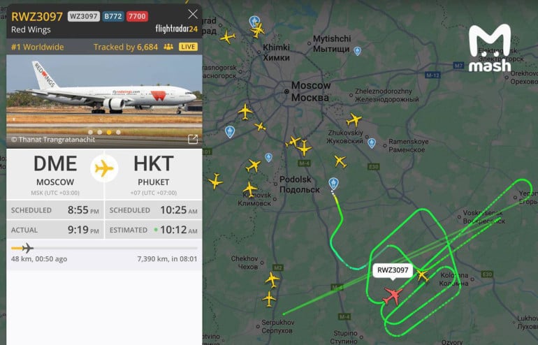 Red Wings Boeing 777-200-ը այժմ պտտվում է Մոսկվայի մարզի վրայով՝ պատրաստվելով հարկադիր վայրէջքի Դոմոդեդովո օդանավակայանում: Օդանավում 412 ուղևոր է և անձնակազմի 13 անդամ։