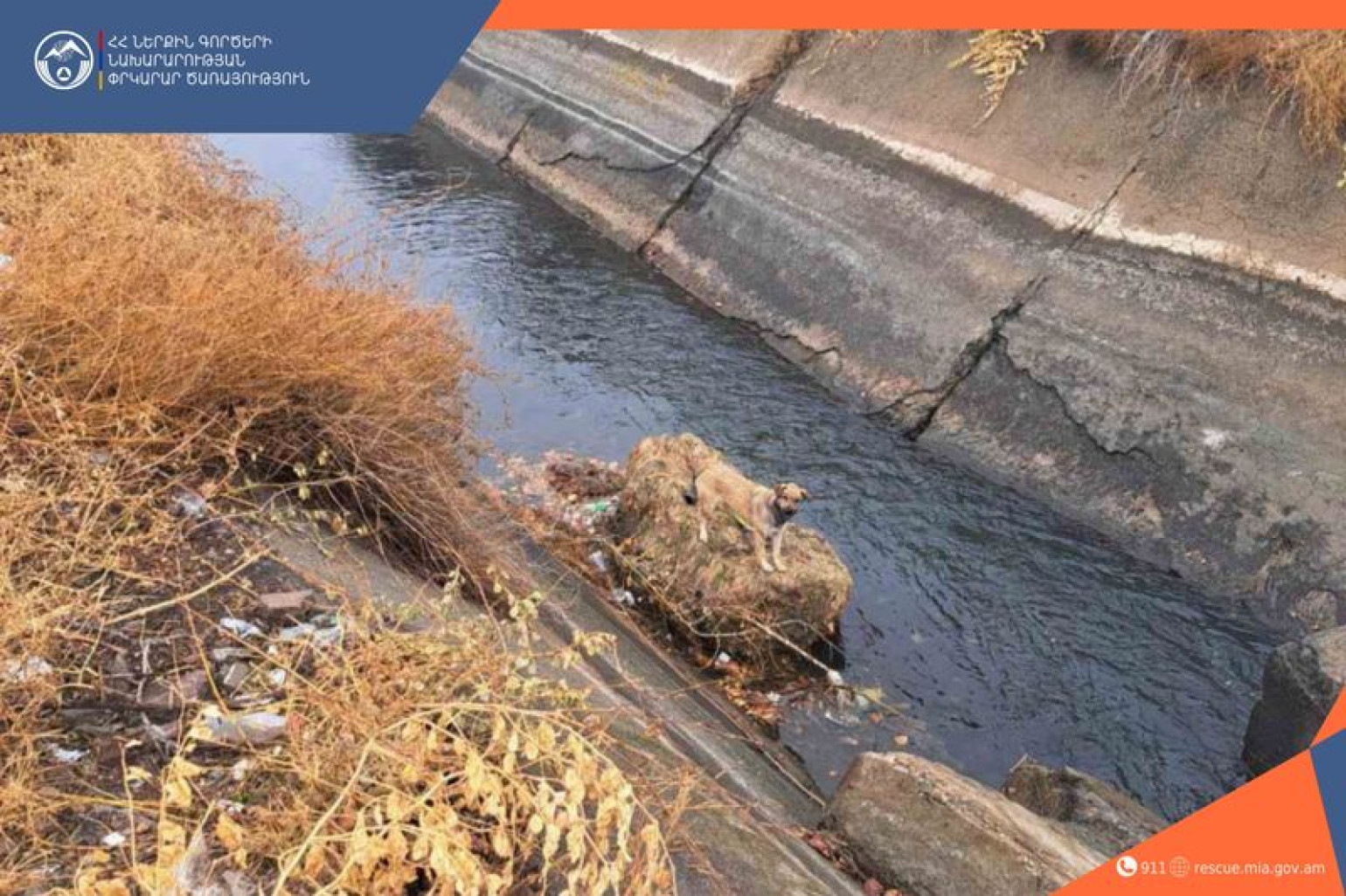 Չնայած սահող և դժվարամատչելի տեղանքին՝ փրկարարական ծառայողների հստակ գործողությունների արդյունքում շունն անվնաս դուրս է բերվել ջրանցքից: