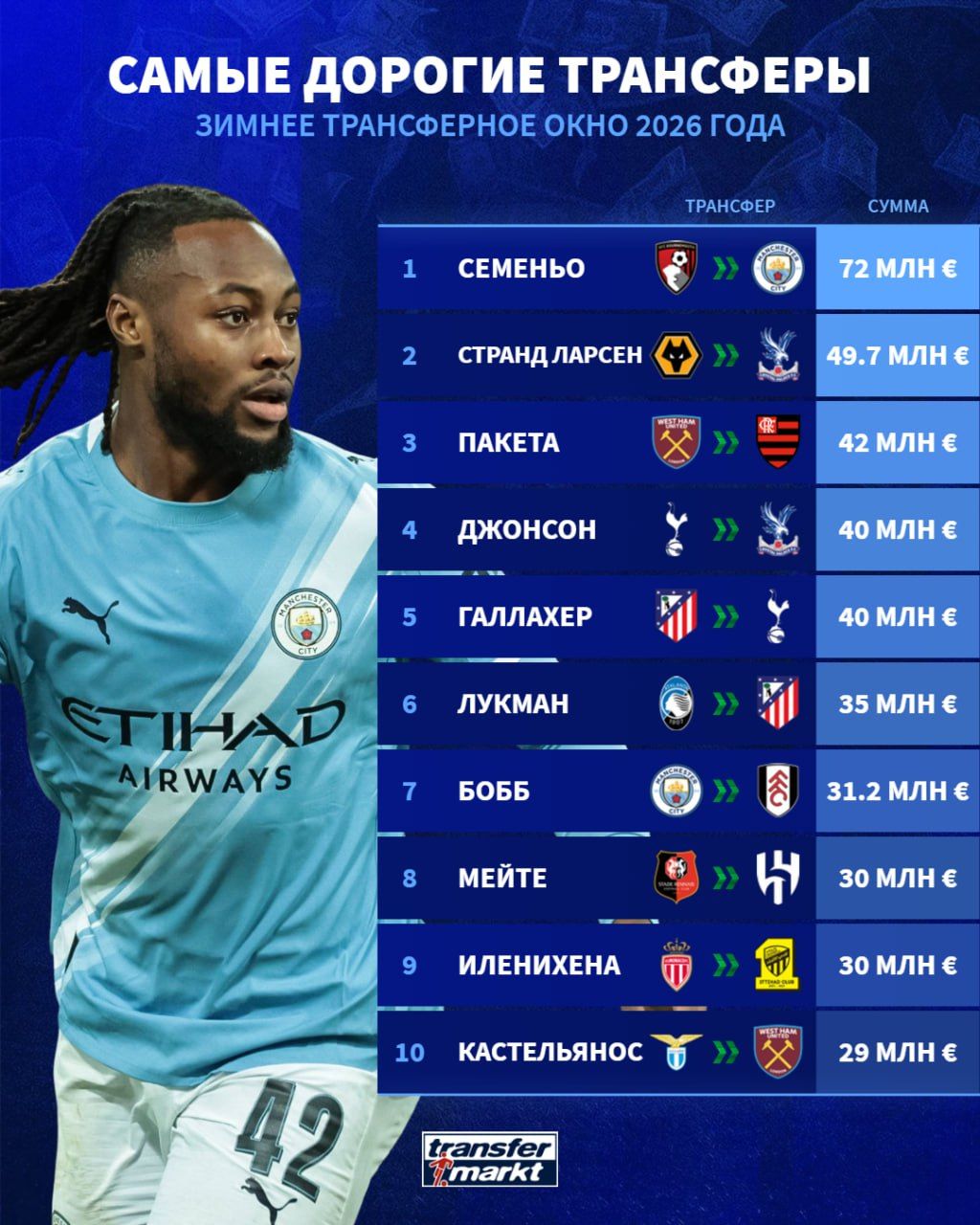 Transfermarkt-ը հրապարակել է 2026 թվականի ձմեռային տրանսֆերային պատուհանի 10 ամենաթանկ տրանսֆերները։
