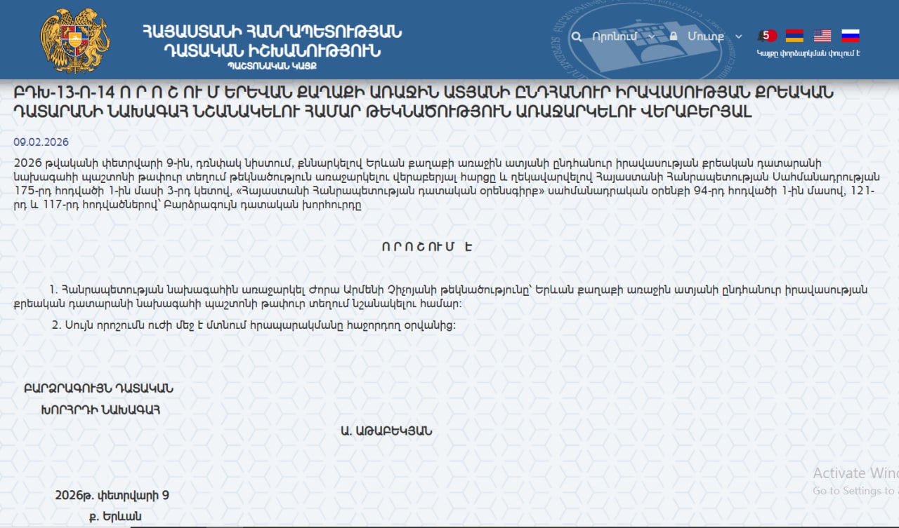 «2026 թվականի փետրվարի 9-ին, դռնփակ նիստում, քննարկելով Երևան քաղաքի առաջին ատյանի ընդհանուր իրավասության քրեական դատարանի նախագահի պաշտոնի թափուր տեղում թեկնածություն առաջարկելու վերաբերյալ հարցը։