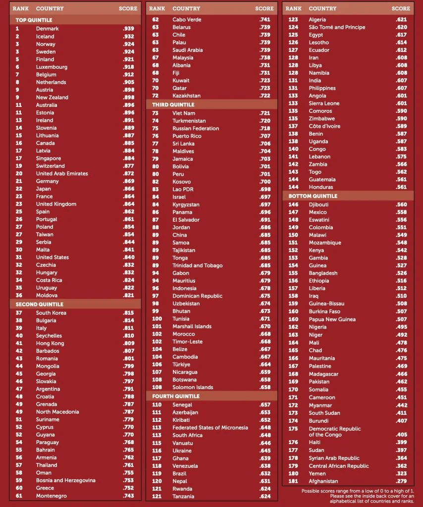 Հաշվի են առնվում այս երեք կատերգորիանները և տրվում են միավորներ։ Ըստ հետազոտության արդյունքների՝ 181 երկրների ցանկում Դանիան առաջին տեղում է, իսկ վերջին տեղում՝ Աֆղանստանն է։ Առաջատարները սկանդինավյան երկրներն են։ Թուրքիան այս ցանկում 106-րդն է։ Հարավային Կովկասի երկրներից Վրաստանը զբաղեցնում է 45-րդ տեղը, Հայաստանը՝ 56-րդը, Ադրբեջանը՝ 111-րդ, իսկ Իրանը՝ 128։