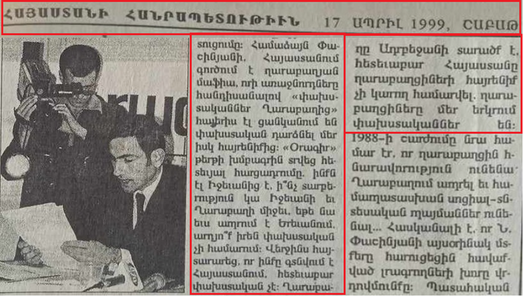 Այսպես, դեռևս 1999թ. ապրիլի 16-ին «Օրագիր» թերթի խմբագրի կարգավիճակում Նիկոլ Փաշինյանը, մասնավորաբար, հայտարարել է. «Ղարաբաղը Ադրբեջանի տարածք է, հետևաբար Հայաստանը ղարաբաղցիների հայրենիք չի կարող համարվել. ղարաբաղցիները մեր երկրում փախստականներ են»: