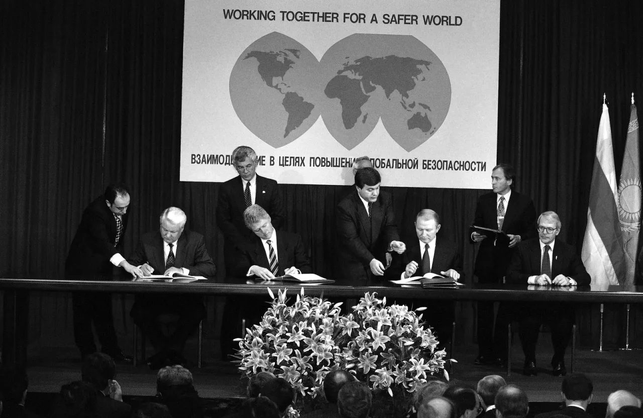 1994թ․ դեկտեմբերի 5-ին ԱՄՆ-ը, Մեծ Բրիտանիան և Ռուսաստանը Բուդապեշտում երեք հուշագիր ստորագրեցին Ուկրաինայի, Բելառուսի և Ղազախստանի հետ։ Դրանք պարունակում էին անվտանգային հավաստիացումներ (security assurances)՝ նշված երկրների կողմից միջուկային զենքից հրաժարվելու դիմաց։ Հուշագրերից մեկը վերաբերում էր Միջուկային զենքի չտարածման պայմանագրին Ուկրաինայի միանալուն։