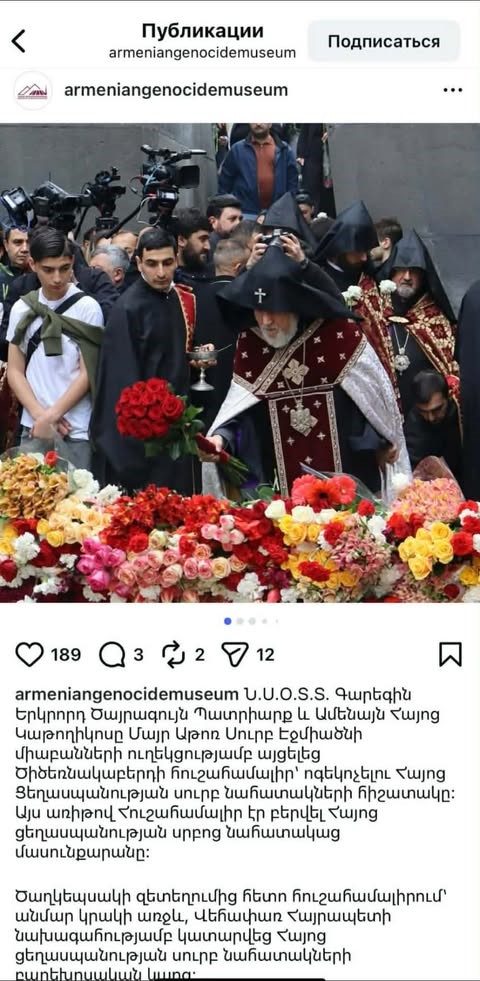 Հայոց ցեղասպանության թանգարան ինստիտուտի կայքում ու Ֆեյսբուք սոցցանցի էջում այսօր անդրադարձել էին Վեհափառի այցին՝ լուսանկարներով ու տեղեկատվությամբ: Ժամեր անց՝ և՛ կայքից, և՛ սոցցանցից հեռացվել էր գրառումն ամբողջությամբ՝ թանգարան ինստիտուտի կայքում անդարադարձ թողնելով միայն վարչապետի ու իշխանության մյուս ներկայացուցիչների այցերին: